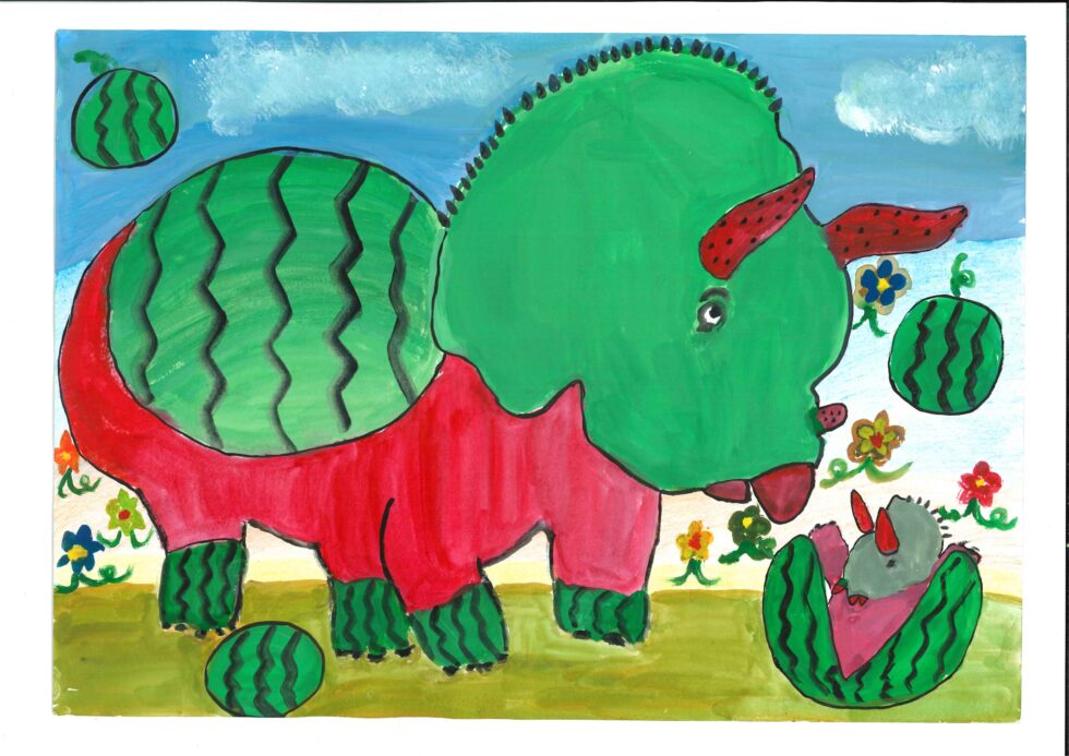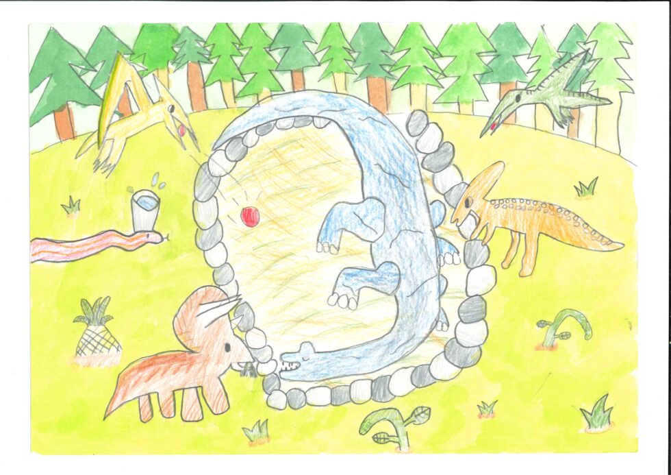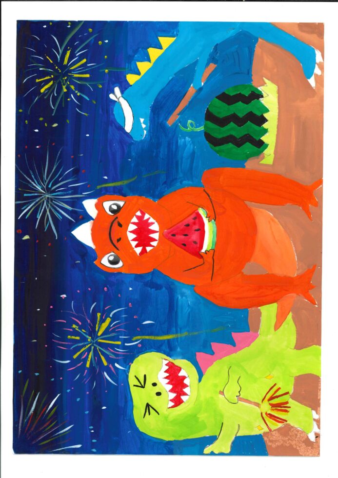 第17回『恐竜を描こう』入賞者発表・4年生の部 2025年10月10日 金賞 石塚花愛 「スイカサウルス」 銀賞 山川永翔 「しぜんを守る恐竜」 銀賞 石田葵 「楽しい夏祭り」 銅賞 山口桔平 「荒れた土地を豊かにするメグミサウルス」 銅賞 村山凜音 「おじいさん恐竜をお世話しよう」 銅賞 中野響渡 「夜こっそり遊んでいる恐竜たち」 銅賞 土田花菜子 「ダープルスカイホワイト」 ご入賞されたみなさま、おめでとうございます!